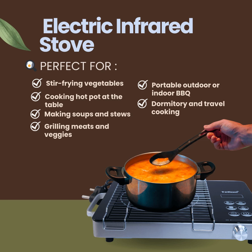 Energy-Efficient Operation: Infrared heating minimizes energy loss and heats cookware directly, offering up to 90% heat efficiency.